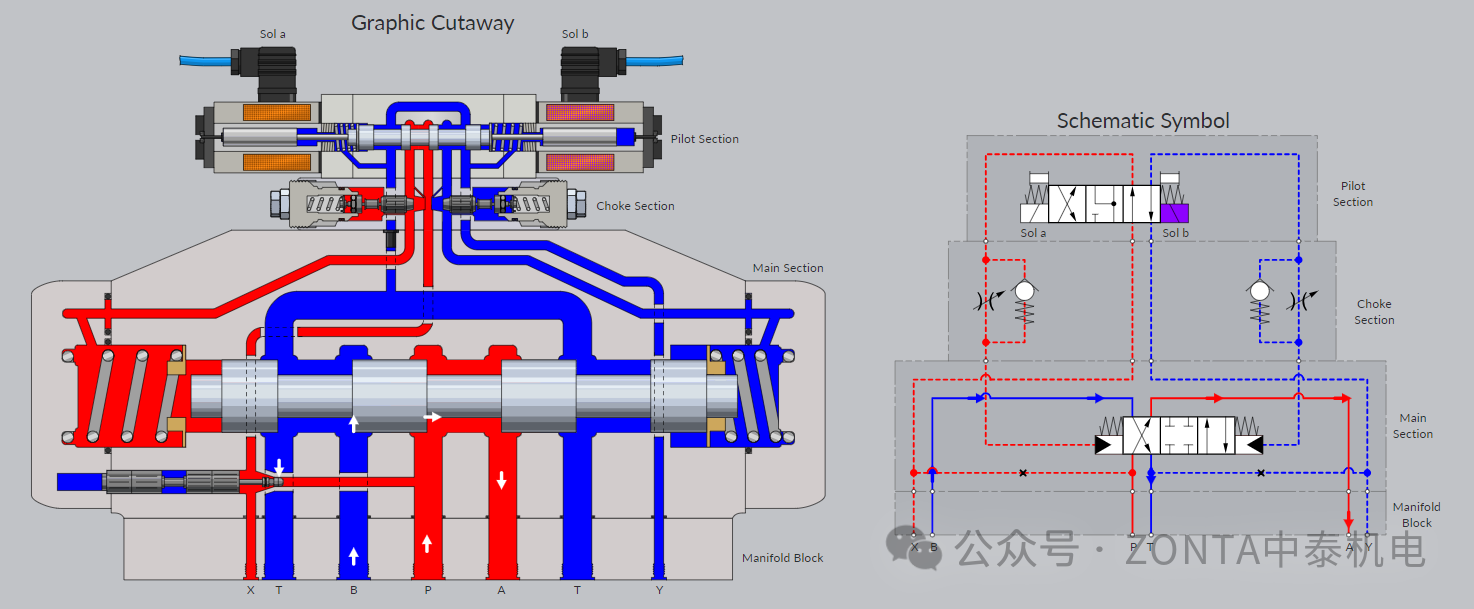 電磁鐵A得電,內(nèi)控內(nèi)排,進(jìn)口節(jié)流