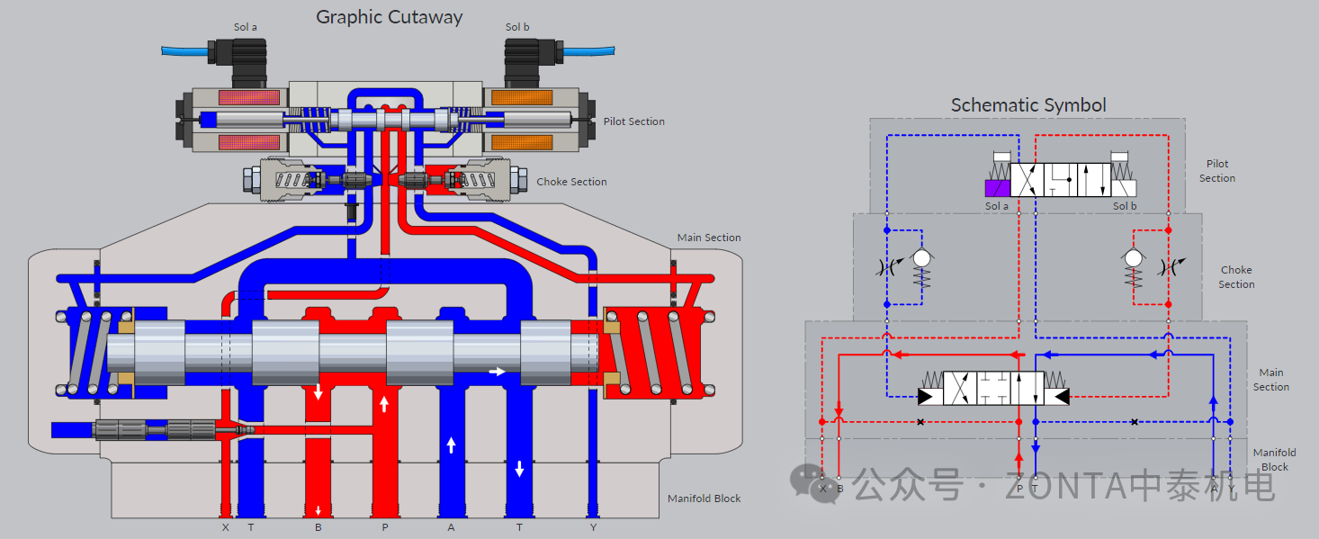 E型中位機(jī)能換向閥電磁鐵得電時(shí)的閥芯動(dòng)作