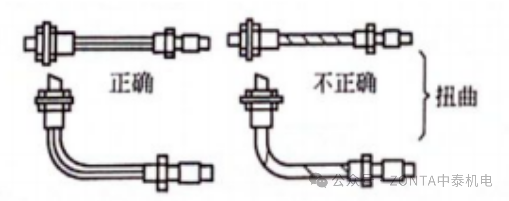3、由于管子的彎曲角度不對(duì)(下圖a),以及接管長(zhǎng)度不對(duì)(下圖b),管接頭擴(kuò)口處很難密合,造成泄漏。為保證不漏,應(yīng)使彎曲角度正確和控制接管長(zhǎng)度適度(不能過長(zhǎng)或過短)。